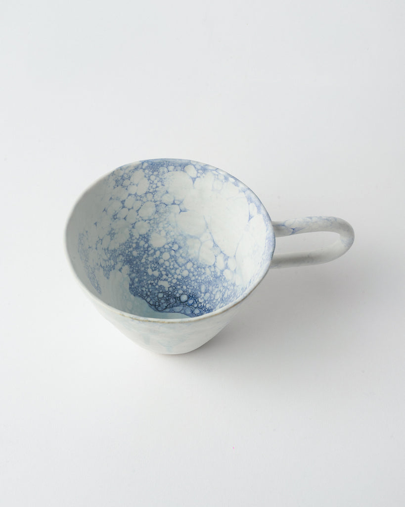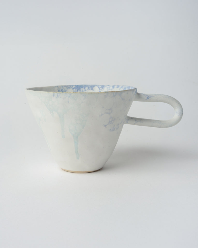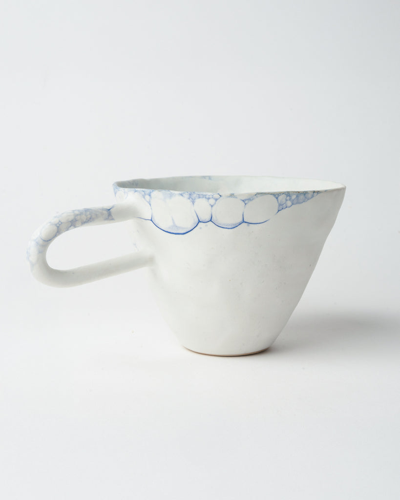 A sophisticated mug, textured with a white stoneware clay, with the pinch pot technique, an ancient pottery making technique that involves creating forms without a pottery wheel, using hands, fingers and simple tools. Decorated with light & dark blue bubbles, this mug “carries” the fingerprints of its creator, standing out for its uniqueness. It shaped and glazed entirely by hand, creating a gorgeous organic feel with no two pieces exactly the same.