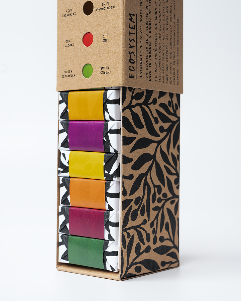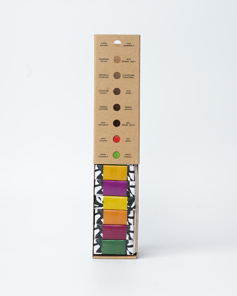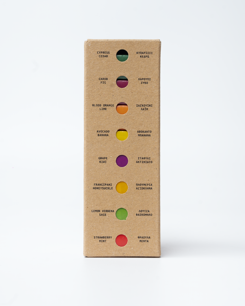 Contains 8 soaps 30gr (Cypress & Cedar, Carob & Fig, Blood orange & Lime, Avocado & Banana, Grape & Kiwi, Frangipani & Honeysuckle, Lemon Verbena & Sage, Strawberry & Mint).